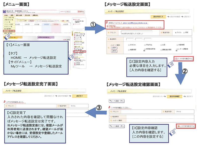 学務情報システムから発信されるメッセージを、予め自分が指定しておいたメールアドレスに転送して読むことができます。転送先アドレスを設定するには、下図に示された手順に従ってください。