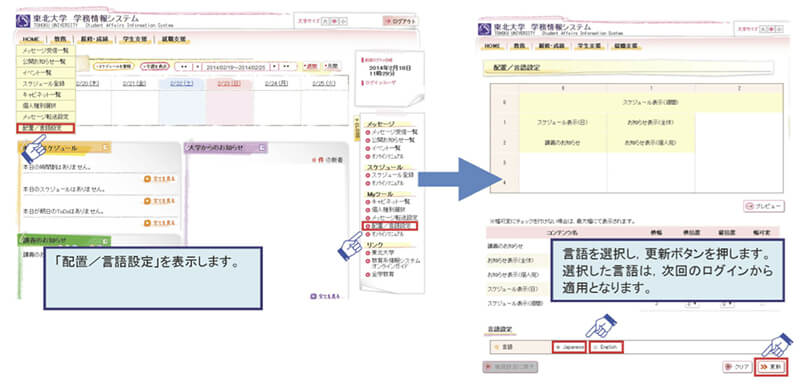 言語設定を切り替えるには、学務情報システムにログインした後、下図のように “HOME” メニューから「配置/言語設定」を表示させてクリックし、その後使用したい言語を選択して「更新」ボタンを押します。次回のログインから選択された言語の環境になります。