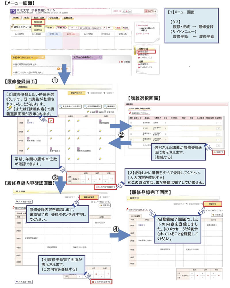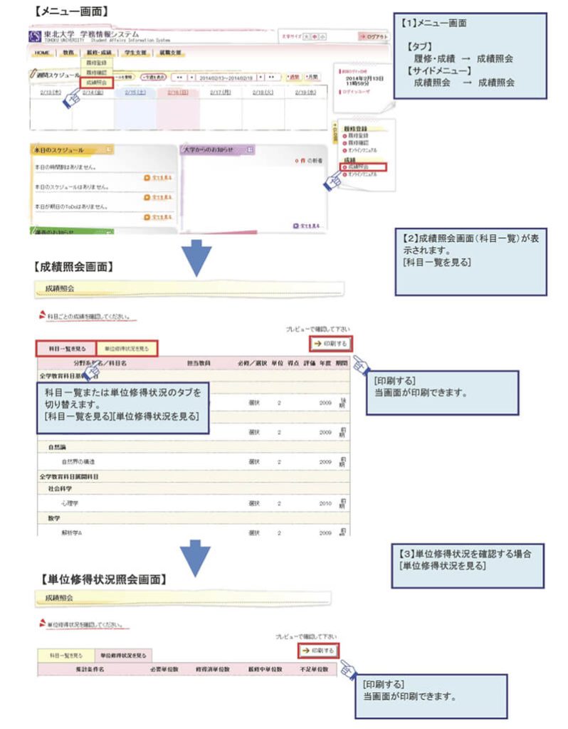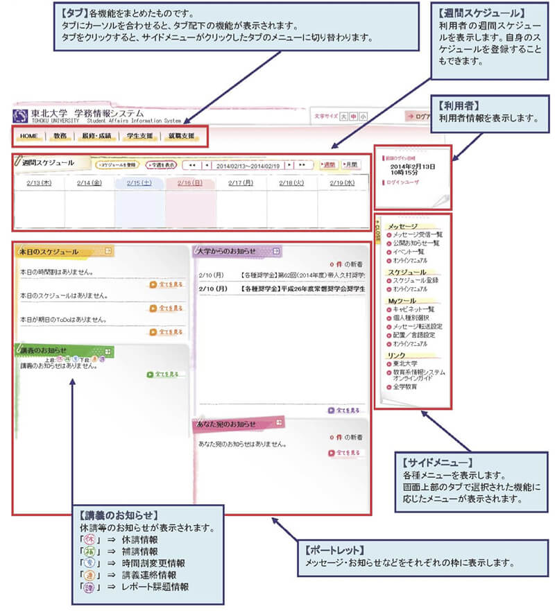 履修科目の登録やその確認, 成績照会、大学からのお知らせ配信などのサービスを提供する情報システムとして、東北大学では「学務情報システム」と呼ばれる統合的なシステムが稼働しています。このページでは、このシステム上で履修科目の登録およびその確認、成績照会の機能を利用する方法を中心に簡単に説明します。