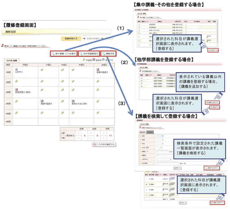 5.1節で述べた登録方法とは別に、集中講義等や他学部・学科の授業科目を登録したり、講義を検索して登録することもできます。次の図に示された手順に従って操作してください。