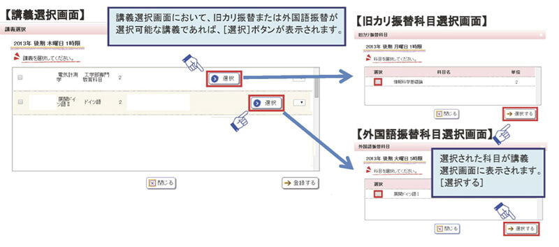旧カリキュラムの科目や外国語科目の振替を行うには、次の図に示された手順に従って操作してください。